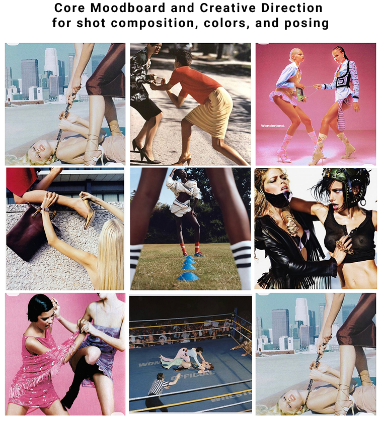 Three moodboards for photography composition and creative direction. One full moodboard for each model styling, hair, and makeup.